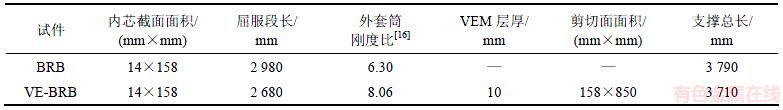 防屈曲支撑(buckling restrained brace,简称BRB)通过在普通支撑外部包裹外套筒(约束构件),可以防止支撑在受压时提前发生屈曲造成支撑拉压性能不对称[1-3]。防屈曲支撑作为一种位移型金属耗能器,因其优良的经济性、适用性与稳定性,近年来已被广泛地运用在消能减震、加固改造等工程[4-6]。BRB在多遇地震作用下处于弹性阶段,在罕遇地震下屈服耗能,即小震作用下不提供阻尼。这种体系不仅提高了结构刚度,而且提高了输入结构的地震作用,在接近场地特征周期段,同等附加刚度下地震作用的提高更大,层间位移角的减小幅度更小,甚至有可能出现刚度过大层间位移角不能下降的情况[7]。黏弹性阻尼器(VED)是一种速度型耗能器,通过滞回耗能吸收地震能量,可提高结构阻尼比,但黏弹性阻尼器附加给结构的刚度较小,当主体结构太弱时,需要为结构布置较多的阻尼器才能满足层间位移角要求[8],近年来有学者提出位移型+速度型阻尼器的混合消能减震结构体系[9-12]。本文作者提出一种新型的复合消能支撑(viscoelastic buckling restrained brace,简称VE-BRB),其工作机理相当于防屈曲支撑与黏弹性阻尼器(viscoelastic damper,简称VED)的并联[13]。防屈曲约束支撑和黏弹性阻尼器混合使用(BRB+VED)体现刚柔结合,即采用适量BRB增大主体结构的侧向刚度,改善扭转特性,再采用黏弹性阻尼器整体提高结构的减震效果,应用得当则可发挥各自优势。但这种新型复合消能支撑实际工作性能如何以及其构造工艺与设计方法是否合理可行,仍需进行性能试验验证。此外,防屈曲支撑属于位移相关型阻尼器,进行性能试验时常采用低周往复加载;黏弹性阻尼器属于速度相关型阻尼器,进行性能试验时常采用高速位移往复加载。复合消能支撑采用加载频率为0.3 Hz的高速往复加载试验进行抗震性能研究。