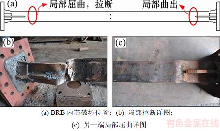 试验过后剖开防屈曲支撑外套筒,发现芯材一端已被拉断,并存在明显局部屈曲的现象,芯材另一端也存在轻微的局部屈曲,位置均发生于芯材屈服段靠近加劲肋端部的位置,此处为芯材屈服段与弹性段交界的位置。芯材其他位置形状平整,并没有出现明显的高阶屈曲波形。防屈曲支撑破坏模式见图6。估计破坏位置存在刚度突变造成的应力集中或者焊接产生的残余应力,降低了内芯低周疲劳性能。