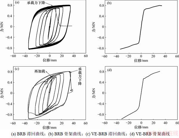 2根支撑的骨架曲线皆可用双线性模型表示。其中复合消能支撑的屈服后刚度略大于防屈曲支撑的屈服后刚度,原因是黏弹性阻尼器为复合消能支撑提供了附加刚度。