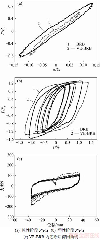 因支撑构造及加工工艺的不同,2根支撑芯材屈服段长度不一:在相同支撑位移下,2根芯材屈服段应变、应力也不一样。为了使2根消能支撑具有可比性,对2根支撑滞回曲线进行量纲一处理,其中纵坐标P/Py为支撑实测轴力P与计算屈服轴力Py(材性试验测得的屈服强度与屈服段面积的乘积)之比,横坐标ε为内芯屈服段的轴向应变(拉线位移计测得的内芯轴向位移δ与屈服段长度之比)。为了方便地观察、对比2根支撑滞回曲线,这里均取每级工况性能稳定的第2圈加载滞回曲线,如图9(a)和(b)所示。从图9(a)和(b)可知:防屈曲支撑在弹性阶段滞回圈面积很小,几乎不耗能,而复合消能支撑能形成类椭圆形的滞回圈,且滞回圈面积较大,说明复合消能支撑在内芯不屈服的情况下也能耗能;在内芯塑性阶段,复合消能支撑及防屈曲支撑滞回圈面积差别不大,但复合消能支撑刚度明显更大。由前述试验现象及图9(c)滞回曲线可知:防屈曲支撑及复合消能支撑内芯拉断后,防屈曲支撑不能继续承受轴力而退出工作,而复合消能支撑因黏弹性阻尼器仍能正常工作,其滞回曲线饱满,拉压形状对称,说明复合消能支撑不仅具有多重耗能体系,更能为结构提供多重安全保障。