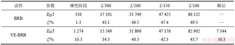 复合消能支撑塑性阶段各工况下滞回圈面积都略小于防屈曲支撑,原因主要有:1) 防屈曲支撑芯材屈服段长度约为复合消能支撑的0.9倍,所以,在相同支撑位移下,防屈曲支撑芯材屈服段应变及应力更大,造成的滞回圈面积也会相对较大。2) 试验系统“应激”的冲击波可能造成复合消能支撑芯材性能一定程度 下降。