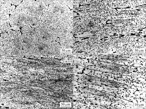 Fig.1 Microstructures of 7050 samples under different conditions: (a) Uniform heat treatment; (b) Water quenched after deformed to reduction of 80%; (c), (d) Slow cooling after deformed to reduction of 80%