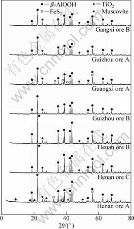 As shown in Fig. 1, Henan ore A and Guangxi ore A have obvious characteristic diffraction peaks of pyrite crystal at 2θ=33.08° and no other phase of S appears in the XRD pattern. This indicates that the primary phases of sulfur in two types of high-sulfur bauxites are pyrite. In addition, Guizhou ore B only has a weak diffraction peak at 2θ=33.08°, while other ores have no peaks of pyrite crystal at all. This indicates that there is very small content of pyrite in these bauxites. Although Henan bauxites B and C have very high content of total sulphur, respectively 0.78% and 0.85%, there is no obvious characteristic diffraction peaks at 2θ=33.08°, and this may be due to the small content of pyrite. In addition, XRD verifies that these seven bauxites are all diaspore (β-AlOOH) and contain a different amount of titanium-containing minerals, such as TiO2.
