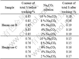 As shown in Table 5, 2% sodium carbonate solution can meet the requirements of washing. The content of the total sulfur in ore is lowered from 0.75 % to below 0.2% and can meet the production requirements for the sulfur content. Therefore, this type of ore can be used again.