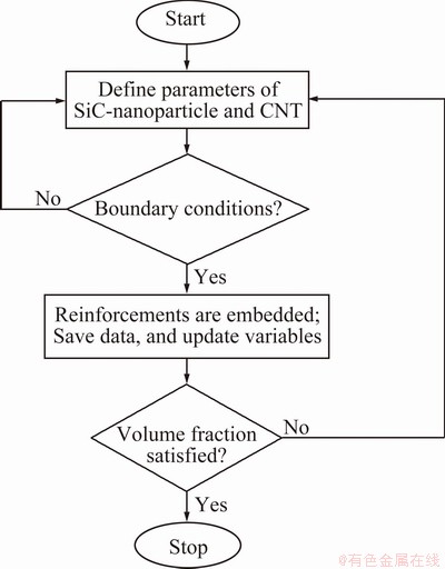 3D RVE model of randomly distributed CNTs and SiC nanoparticles reinforced Mg matrix hybrid composites was generated based on Python programming and random sequential adsorption (RSA) modeling method [16]. In order to ensure a continuity of reinforcements in any direction and a given reinforcement volume fraction, partial reinforcements beyond the boundaries of the model were chopped and moved in parallel to the interior of the model. In the RVE model, the hybrid reinforcements did not overlap and intersect with each other, and they were not in contact with the model boundary. The programming algorithm for generating random hybrid reinforcement distribution RVE is shown in Fig. 1.