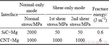 The cohesive behavior for the interfaces between Mg matrix and reinforcements was described by the cohesive model based on our earlier molecular dynamics simulations. The cohesive parameters [24,25] are listed in Table 5.