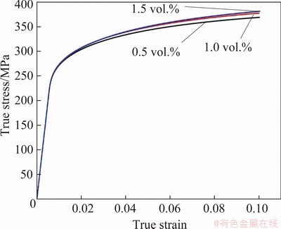 Fig. 3 Stress-strain curves of Mg matrix hybrid nanocomposites with different total reinforcement volume contents and volume fraction ratio of CNTs to SiC nanoparticles of 8:2 at 100 °C and strain rate of 1000 s-1