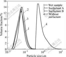 表面活性剂能在界面上聚集,能降低界面张力,从而改变界面的性质。本文作者在湿粉体中选择性地加入了表面活性剂A或B,其中A的结构为HO— R—SO3Na R为烷基;B为易溶于水的高分子化合物,平均相对分子质量约为10 000,主要官能团为羧基和羟基,表面活性剂加入量为湿滤饼质量的0.05%)。在50℃下恒温干燥,表面活性剂对粉体粒度分布曲线的影响如图1所示。其中样品1为原始样品(洗涤后的滤饼,没有干燥),样品2、3和4为干燥样品。