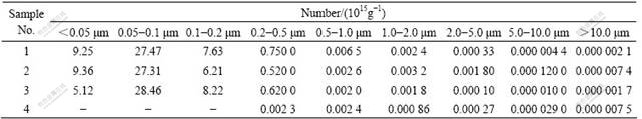 表1中的结果表明,相对于样品1,加入表面活性剂(A或B)后的样品2和3经干燥后,粒子总数减少幅度较小。如加入表面活性A后,样品2的粒子总数比样品1的粒子总数减少了3.77%,可能是细粒子表面能高,易于吸附表面活性剂的原因,小于0.1 μm的粒子数变化较少,0.5~10 μm粒子减少幅度相对较大,大于10 μm的粒子数略有增加;若加入表面活性B,样品3的粒子总数减少了5.99%,小于0.2 μm的粒子数变化较少,1.0~2.0 μm的粒子数有增加;而不加表面活性剂时,样品4的粒子总数比样品1的粒子总数减少了99.98%,同时小于0.2 μm的粒子全部消失(被团聚),0.2~1.0 μm间粒子总数也有所减少,大于1.0 μm的粒子总数是增加的。