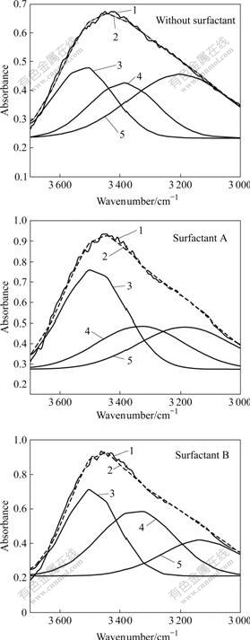 Fig.3 Multi-peak fitting of IR spectra with or without surfactant: 1-Original IR spectrum; 2-Simulated IR spectrum; 3-Free O—H; 4-O—H in dimmer; 5-O—H in molecular association