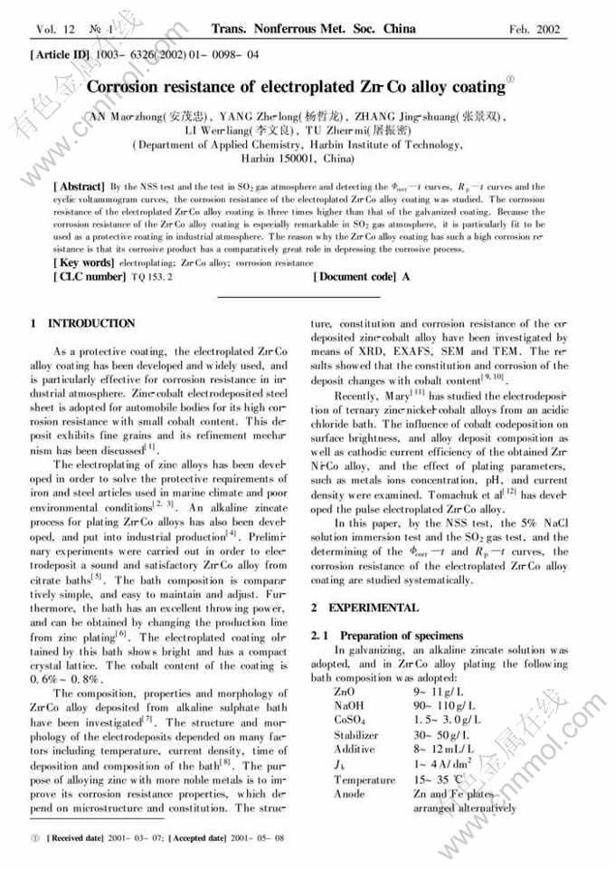 Key words:electroplating; Zn-Co alloy; corrosion resistance