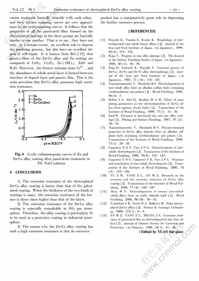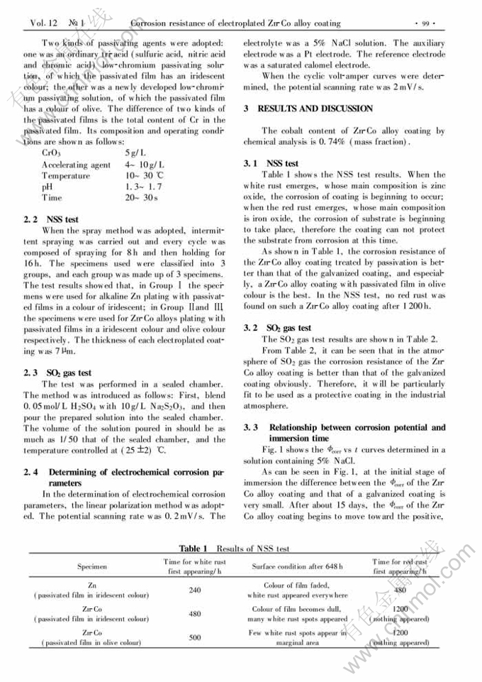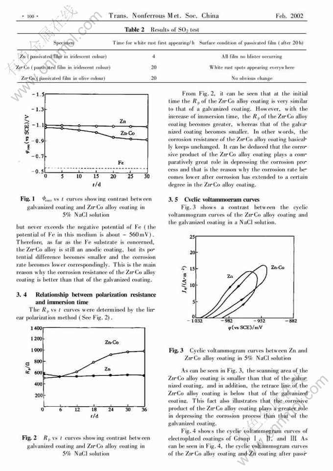 Abstract: By the NSS test and the test in SO2 gas atmosphere and detecting the φcorr—t curves,Rp—t curves and the cyclic voltammogram curves,the corrosion resistance of the electroplated Zn-Co alloy coating was studied.The corrosion resistance of the electroplated Zn-Co alloy coating is three times higher than that of the galvanized coating. Because the corrosion resistance of the Zn-Co alloy coating is especially remarkable in SO2 gas atmosphere,it is particularly fit to be used as a protective coating in industrial atmosphere.The reason why the Zn-Co alloy coating has such a high corrosion resistance is that its corrosive product has a comparatively great role in depressing the corrosive process.