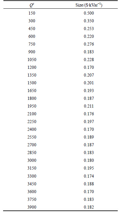 Table 1 shows some commercially available capacitor sizes with $/kVar which are used in the analysis. Note that just fixed capacitors are used and the marginal cost of capacitors are used to calculate the total yearly cost which are given in Table 1. The fixed cost of the capacitor, Kcf, is selected as $1000 (the maintenance and running costs are neglected) [32].