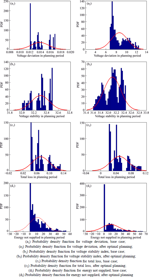 Lately, distribution automation (DA) has attracted attention which is widely used in smart grids environment. So it has been widely grown as an important issue [1]. One of the most important DA functions, is the distribution system reconfiguration (DSR) process. Distribution feeders include sectionalizing switches and the tie switches. Main goal of DSR is to find the best and optimal configuration of the distribution network and modify its topological structure with varying the status of sectionalizing and tie switches in order to achieve; several goals. These goals are: 1) obtaining the minimum active power losses, 2) meeting the energy demand, 3) solving overload's problems (load balancing), 4) volt/Var support (maximizing load-ability), 5) system restoration and 6) maintaining system reliability [2]. Significant amount of the energy that is generated in power plants is wasted in generation, transmission and distribution levels where distribution networks play more important role regards causing power losses about 5%–13% of the total power generated [3]. In this regard, effective methods to reduce power losses in the distribution network have been studied in Refs. [4, 5]. The DSR is a multi-objective problem that it is non-linear, combinatorial optimization problem with numerous constraints, including topology constraints, electrical and operating constraints as well. There are several publications solving this problem via different techniques. DSR was firstly proposed by MERLIN and BACK [6] as an efficient method for reducing power losses. As well as, many publications have presented application of optimization algorithms to solve DSR problem [7-15] which were focused on the optimization algorithms’ efficiency that were selected as an optimization tool to find the best switching combination in the network leads loss minimization. According to review of research works, it is obvious that the existence of RESs and/or capacitors plays an important role in distribution network and is really beneficial for distribution network. Their benefits are: economics, environmental and technical. The economic benefits include reduction of transmission and distribution costs, electricity price and saving of fuel. The environmental benefits are reducing sound pollution and emission of greenhouse gases; and the technical viewpoints are reducing line loss, peak shaving, improving voltage profile of system and load factors and increasing power quality [16-19]. In other words, optimization problem of DSR with considering different kinds of DG’s and/or capacitors placement improves integrity, reliability and efficiency of the system. There are papers which consider DG or/and capacitor placemen besides DSR problem. A technique presented in Ref. [20], to solve both DSR and DG placement problems, simultaneously, studies critical system condition in distribution systems as well. FAZEL and HOSSEINI [21] show that the influence of network configuration and location plus size of DG should be taken into account in the planning process at the same time. In this work, DSR problem, for taking network configuration effect into account that runs in offline mode with constant loads, and optimal DG allocation and sizing problems are studied at the same time. In order to realize power loss minimization an optimum switching operation plan for DSR and DG size at the same time was presented in Ref. [22]. The DSR problem is solved considering various optimum switching operation plan for DSR and DG size simultaneously [23]. A multi-objective function considering mixture of power loss saving, voltage profile, voltage unbalance and current unbalance of the system has been proposed in Ref. [24] to figure out an optimal solution for DSR and DG allocation in both balanced and unbalanced networks. A novel method had been proposed in Ref. [25] in order to find an optimum DSR and DG placement in distribution system for obtaining power loss minimization and voltage stability improvement. Both the DSR and capacitor placements are considered at the same time to reduce power loss in Refs. [26, 27]. A literature review pointed out some study efforts to solving DSR problem, and somewhat, simultaneous DSR with allocation of DG units and capacitor siting and sizing; however, most of the work presented, has focused on loss minimization and there is no paper covering all aspects of power distribution network, and also almost all the papers assume that the load demand and/or market price is constant in time horizon in planning period with no associated uncertainties. Therefore, it seems that the planning of power system by considering uncertainties is the most important challenge for the decision makers. Generation and consumption balance must maintain in real time and the power grid must be capable of transferring the required energy of consumers to them. Due to several factors, e.g. economical, geographical, climate change and stuff, it is not able to provide a high accurate load forecasting for future load demand. Next, the electric system is highly capital intensive, and the investments have long lead times and multi-decade economic lifetimes. Thus, power grids planning and managements are higher valuable, which leads to high power quality at relatively low costs. It gives the impression, existence of a methodology to solve the optimal DSR and sitting and sizing of renewable energy resources (RESs) with constant and variable output power besides capacitor placement at the same time in an uncertain environment that considering the DisCo’s perspective is necessary. This research work offers a novel approach from the DisCo’s perspectives to solve the multi-objective problem which consists of DSR problem and allocation RESs that have constant and variable output power respectively beside capacitor placement, all at the same time. Note that all the uncertainties in future load demand and market price and the output power of wind-based D