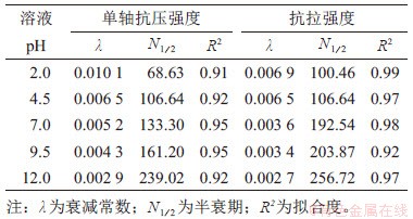 室内试验结果表明,化学溶液pH对冻融作用下粉砂岩抗压强度和抗拉强度的衰减有着显著影响。这意味着不同pH的溶液,粉砂岩强度在单次冻融作用下的平均损失及其降至初始值一半时所经历的冻融循环次数是变化的。因此,衰减常数、半衰期与pH存在一定的函数关系,可表示为