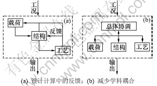 设计计算采用顺序过程,反馈较少,信息在学科间单向流动,优化设计只能在过程内部实现,整体优化需要对零件的受力、结构、加工工艺进行全面考虑,将设计计算过程从单向顺序式变成多向循环式(如图1(a)所示),计算量急剧增加且收敛性无法保证。MDO通过系统级别的总体协调减少顺序过程所属学科间耦合,将学科间耦合转变为各个学科与总体协调之间的关系(如图1(b)所示),从而实现全面优化。