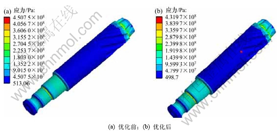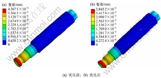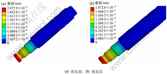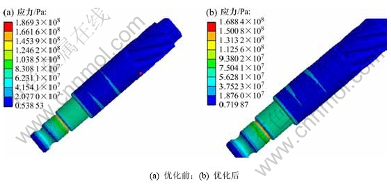 输出轴质量优化设计前为480.0 g,优化设计后为453.8 g,减少5.5%。通过有限元软件计算验证优化计算结果对输出轴的影响,分别计算极限300 N·m纯扭矩、80 N·m助力力矩2种状态下的应力和变形,如图4~7所示。从图4~7可见:在300 N·m极限状态下,优化后最大变形减小4.2%,最大应力减小4.4%;在最大助力力矩(80 N·m)状态下,优化后最大变形减小9.6%,最大应力减小10.1%。