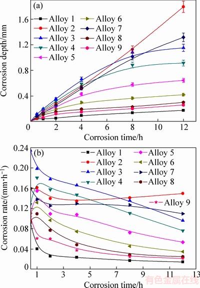 由图3(b)腐蚀速率和时间的关系可知,合金4、5、6和8腐蚀速率随着时间的增加先增加后减少,而合金1、3和9的腐蚀速率随着时间的增加而减少;合金2腐蚀速率随着时间的增加近似平稳不变;合金7腐蚀速率随着时间的增加变化不大。