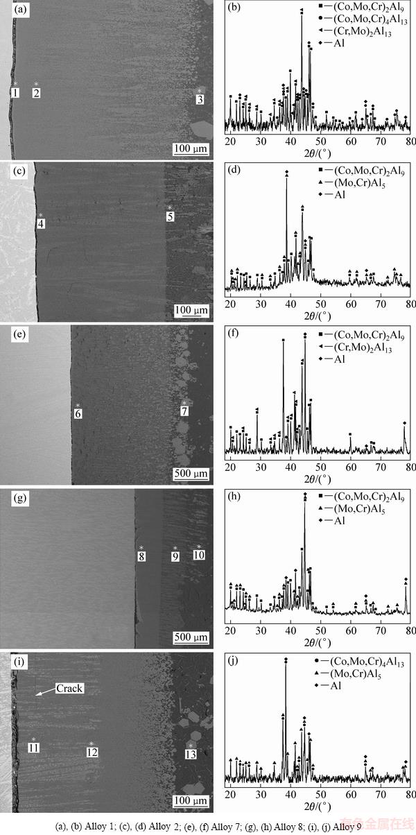 Co-Mo-Cr-Si+Al→(Co,Mo,Cr)2Al9(Co, Cr ,Mo)2Al9+Al→Co+(Mo,Cr)Al5(Mo,Cr)Al5+Al→Cr+Mo+Al