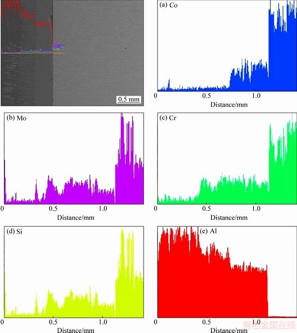 图5(g)所示为合金8在铝液中腐蚀2 h后的腐蚀界面,灰色腐蚀产物是(Co,Mo,Cr)2Al9,灰白色相是(Mo,Cr)Al5,标记点9的能谱线显示结果表明,Cr置换MoAl5中的Mo形成(Mo,Cr)Al5,Mo元素的质量比较大,在扫描电镜背散射的模式下观察时,其比原子质量衬度大,标记9和10的相都是(Mo,Cr)Al5,而标记10的相中Mo含量较多。图5(h)所示为对应腐蚀产物层的XRD谱,其结果和能谱结果一致。图6所示为合金8腐蚀界面线扫描结果。从图6中可以看出,Co元素从基体到铝液的含量递减,(Co,Mo,Cr)2Al9层化合物Co的含量较高,(Mo,Cr)Al5层化合物和铝液中含量较少,(Co,Mo,Cr)2Al9层阻挡了合金和铝液的进一步的反应,随着腐蚀时间的延长,腐蚀速率趋于平衡。Mo、Cr、Si元素在(Co,Mo,Cr)2Al9层化合物和(Mo,Cr)Al5分布基本相同,在(Co,Mo,Cr)2Al9层化合物和(Mo,Cr)Al5化合物的界面元素含量都有所增加。Al元素从铝液到基体逐渐减少,CoMoCrSi合金和铝液的腐蚀速率受到元素的溶解和扩散的影响。