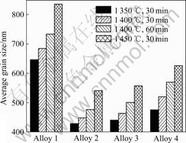Fig.3 shows the variation of the WC grain size of the sintered alloys. Different behaviors are observed in the effect of inhibitor addition on the WC grain growth when being compared with the base alloy (Alloy 1). Obviously, adding VC and/or NbC significantly decreases the average grain size of WC phase. For example, after sintering for 60 min at 1 400 ℃, the mean grain size of WC phase in the Alloy 1 is 723 nm. It is reduced to 470 nm when 1%VC is added (Alloy 2). The WC grain size for the Alloy 3 with 0.5% VC and 0.5% NbC is 491 nm. But, that for the Alloy 4 is increased to 560 nm when 1% NbC is added. Meanwhile, the WC grain size is affected by both the sintering temperature and holding time.