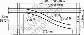 目前,国内尚无桥上无缝道岔的实践经验,对桥上无缝道岔的理论研究刚刚起步,尚未形成系统的桥上无缝道岔计算理论和设计方法。桥上无缝道岔问题已成为制约客运专线轨道设计、施工的技术瓶颈。开展客运专线桥上无缝道岔纵向力和列车-道岔-桥梁系统振动研究,对于我国客运专线建设具有重大意义。一些研究者[1-4]研究了温度荷载作用下,桥上无缝道岔受力与变形的规律,但对列车-道岔-桥梁系统振动的研究很少。