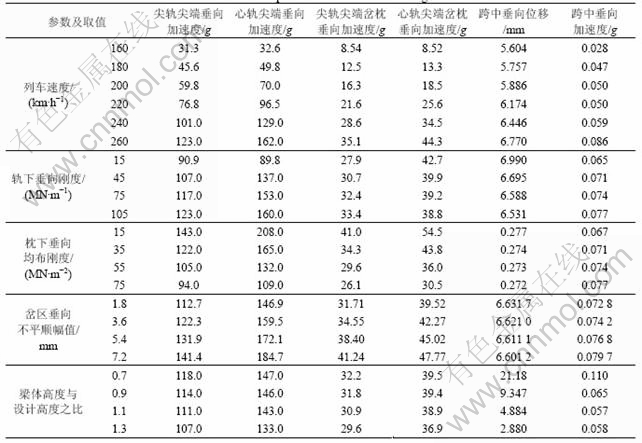 b. 系统响应随列车速度和岔区垂向不平顺幅值增大、梁体高度减小而增加;轨下垂向刚度对系统不同的响应有不同的影响;道岔响应随枕下垂向均布刚度增大而降低。