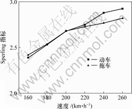 列车从1号岔位直逆向通过时,速度对列车-道岔-桥梁系统振动的影响如表1、表2及图6~8所示。结果表明,系统的各种动力响应均随列车速度的增大而增加;当列车速度为260 km/h时,动车的轮轴横向力和垂向Sperling指标分别为61.55 kN和2.926,拖车轮轴横向力和脱轨系数为43.87 kN和0.792,均接近允许值。