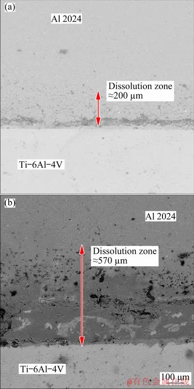 Figure 3 shows the low magnification SEM images of samples bonded at a bonding temperature of 580 °C, bonding time of 30 and 60 min, with Babbitt thermal spray coat as interlayer. Bonding time is one of the most important parameters in TLP bonding process. Therefore, the microstructures of the joints welded at different time were studied. Figure 3 shows the dissolution and widening zone in the TLP bonding for the bond made at different bonding time. With the rise of bonding time from 30 min (Fig. 3(a)) to 60 min (Fig. 3(b)), the thicknesses of dissolution zones increase significantly from 200 to 570 μm because atoms are diffused evenly and fully in longer bonding time. It is observed from Fig. 3 that the width of dissolution zone is more than 200 μm, while that for Al/Ti couple bond using pure Cu [1] and Sn-3.6Ag-1Cu foils by ALHAZAA et al [9] is much lower. This can be attributed to higher diffusion potential of Ti and Al in thermally sprayed interlayer in comparison with foil interlayer, leading to faster homogenization process and wider joint region. In general, it is obvious that the structure of the thermally sprayed interlayer, which is used in this study has higher residual stresses and defects in comparison with the foil interlayer that was employed by ALHAZAA et al [1,9]. This is because of the nature of the manufacturing process. Grain boundary diffusion is a dominant factor in TLP process which occurs much faster than the bulk diffusion. The higher percentage of the grain boundary exhibits in the thermally sprayed interlayer in comparison with the foil interlayer, which increases diffusion of base metals in the liquid phase. Furthermore, imperfections (i.e. boundaries between splats, pores, voids and boundaries of un-melted particles) in the thermally sprayed interlayer (Fig. 2) act as diffusion channels. Voids could act as free surfaces. Due to the very high diffusion rate on the free surfaces (much more than the grain boundary diffusion), they can drastically increase the diffusion rate. This is responsible for the increased width of dissolution region in the case of using thermal spray coat as interlayer.