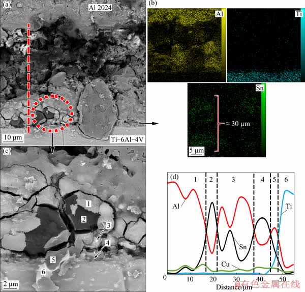 Fig. 5 Microstructure of joint formed at 580 °C for 60 min (a) and elemental distribution of Ti (b), V (c) and Sn (d)