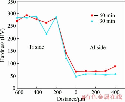 Fig. 7 Microhardness profiles across joint region for bonds made at bonding time of 30 and 60 min