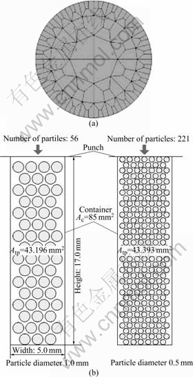 Fig.1 FE Models of compaction processes for two particle sizes using MPFEM: (a) Initial mesh of particle; (b) Particle arrangements and FE models