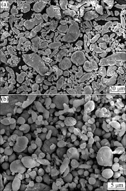 Fig.3 SEM images of Al 1100 powders with average particle size of 20 μm (a) and 3 μm (b)