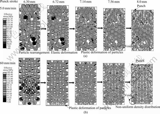 Fig.5 Behavior and effective stress distributions of powders at punch speeds of 5 mm/min (a) and 60 mm/min (b)