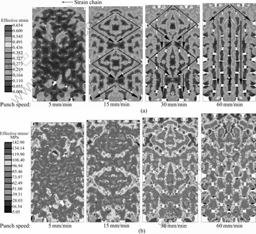 Fig.6 Effective strain and stress distributions of powders for different punch speeds at compaction load of about 1.2 kN: (a) Effective strain; (b) Effective stress