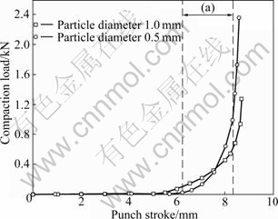 Fig.7 Compaction load—stroke curves of powders with particle diameter of 1.0 mm and 0.5 mm at punch speed of 5 mm/min