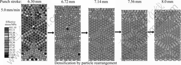 Fig.5 shows the behavior and effective stress distribution of powders at punch speed of 5 and 60 mm/min with punch strokes in Fig.4(a). As the punch stroke increased, powders were densified by particle rearrangement (elastic deformation or local plastic deformation) and plastic deformation at a punch speed of 5 mm/min. On the contrary, at punch speed of 60 mm/min, particle rearrangement was little, and plastic deformation of particles occurred at the lower punch stroke as compacted with that at punch speed of 5 mm/min. Consequently, higher punch speed gave a shorter period of particle rearrangement due to restrictive particle movements.