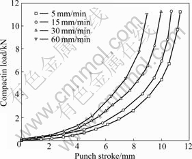 Fig.9 Load—stroke curves of Al 1100 powders with particle diameter of 20 μm for different punch speeds obtained from compaction tests