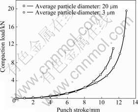 Fig.10 Load—stroke curves of Al 1100 powders with particle diameter of 20 and 3 μm at punch speed of 5 mm/min obtained from compaction tests