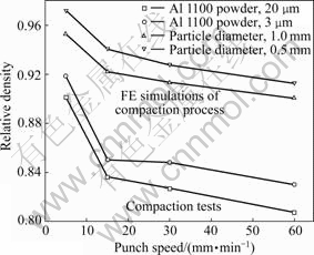 To observe deformation behavior of particles and estimate the relative density for different punch speed and particle diameter, compaction simulations with Al powder using multi-particle finite element model were performed. In order to verify the reliability of finite element analysis, compaction tests for different punch speeds of 5, 15, 30 and 60 mm/min and average particle sizes of 20 and 3 μm were carried out. The results can be summarized as follows: