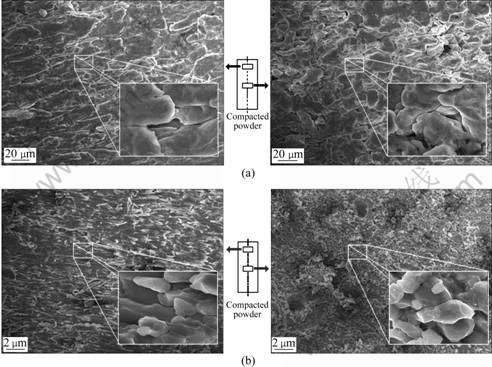 Fig.12 SEM images of compacted powders with average particle size of 20 μm (a) and 3 μm (b) after compaction tests