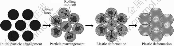 Multi-particle finite element model(MPFEM) with full finite element discretization of the particles was developed by PROCOPIO and ZAVALIANGOS[9] for alternative DEM. They researched a multi-particle compaction problem with different shapes of particle and mechanical properties. The finite element discretization of individual particle in MPFEM gives discrete behavior of particle assembly for compaction of powder with high relative densities, including their large contact deformation.