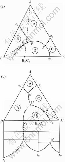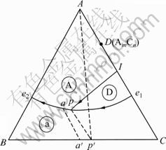 图2所示为具有二元同分熔点化合物的三元相图。连结CD的线把三元相图ABC划分成ADC和DBC两个三元共晶相图。除化合物的D(AmBn)外,其他组元A、B、C的活度计算同于三元共晶相图。因此,下面仅讨论与化合物AmBn有关的活度计算。
