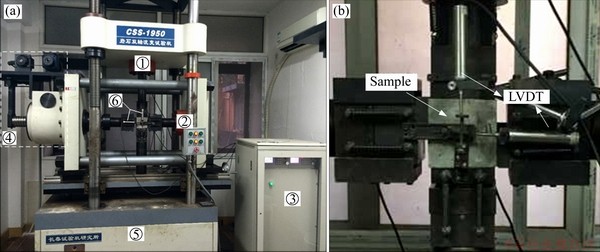 Figure 3 (a) Servo-controlled rheological testing device (CSS-1950) (①Normal force transducer; ②Horizontal force transducer; ③Servo controller; ④Horizontal loading system; ⑤Vertical loading system; ⑥Linear variable displacement transducer (LVDT)); (b) Sample and monitoring system