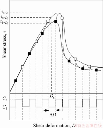Figure 4 Schematic shear stress-shear deformation curve for alternate switching of shear rate from C1 to C2 at each predetermined interval △D [19]