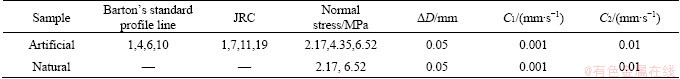 In this study, SASRs were conducted on both natural discontinuity samples and the cement-mortar samples with 1st, 4th, 6th and 10th profile lines, respectively. The σn in SASRs was identified as 10%, 20%, and 30% of the UCS (actual values were 2.17, 4.35 and 6.52 MPa, respectively). The slow and fast shear rates were 0.001 and 0.01 mm/s, respectively, and the value of the uniform deformation intervals was 0.05 mm, which was obtained by the method proposed by HASHIBA et al [20]. The actual testing program used is listed in Table 3.