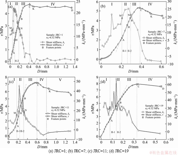 Stage III (BC in Figure 5): There is a significant decrease in shear stiffness from points B to C, which indicated that the development of the cracks was unstable. During this stage, cracks in the asperities of the rock discontinuities developed rapidly. In addition, the shear stress-shear deformation curve changed from linear to convex. When shear stiffness decreased to 0, peak shear strength (τs) was then observed.