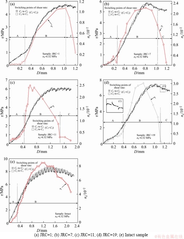 Figure 6 Shear stress and deformation curves of alternate shear rate tests and variations of parameter ns in shear processes when σn=6.52 MPa:
