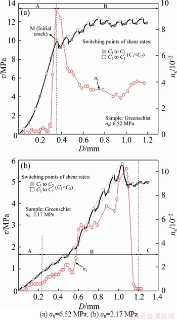 A method, the alternative strain rate (ASR) test proposed by HASHIBA et al [20], studies the strain rate dependency of rock materials using a single sample, and the mechanism relating to the shear (strain) rate-dependent behavior of rocks was obtained by this method. In the study, alternated strain (shear) rate tests were employed to investigate the strain (shear) rate dependency of peak strength and its influential factors. However, although the dependence of shear strength on shear rates was extensively investigated, the results only showed that the shear strain rate had an influence on peak strength. Nevertheless, the studies found that the shear rate-dependent behavior varied dynamically with an increase in shear deformation during the shearing process. The stress-strain or stress-deformation diagrams relating to the test results demonstrated that strain (shear) rate dependency was closely related to the development of strain (deformation) or stress. Therefore, these results can be used to predict the characteristics of time-dependent behavior, such as creep and stress relaxation, in states with different stresses or deformations (strains). However, no further research has been carried out by these experimental investigations.