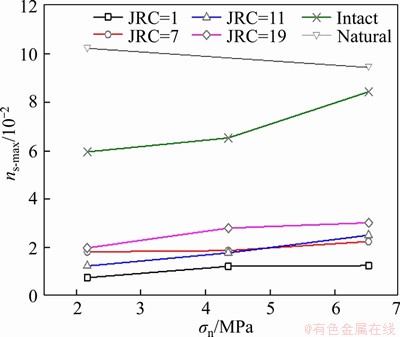 Figure 9 Relationships between maximum ns and normal stress (σn) of rock discontinuities with different JRC